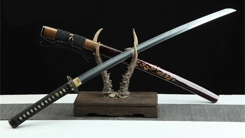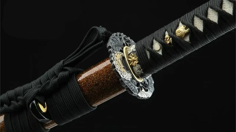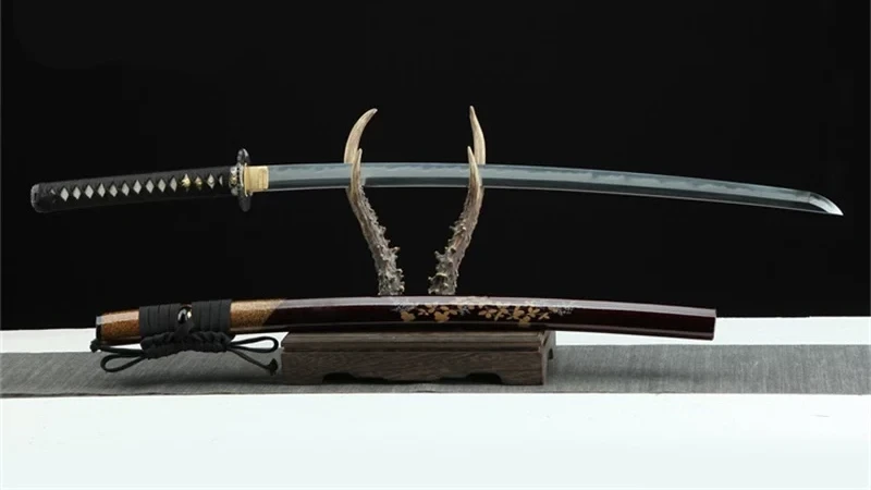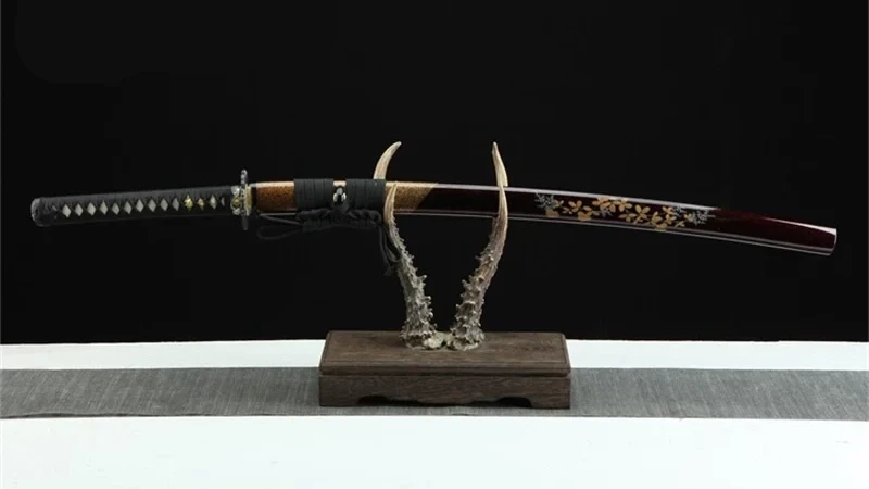 | Scabbard (Saya 鞘): | Burgundy and sandy brown hardwood with carved shell flowers |