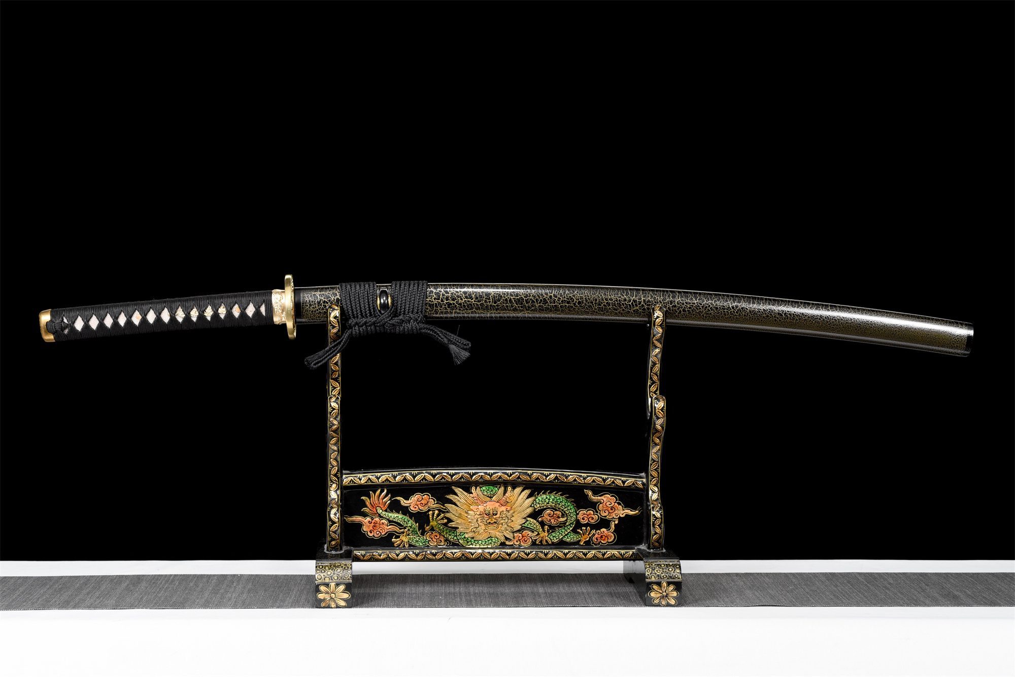 | Scabbard (Saya 鞘): | Black lacquer with a golden feline motif |