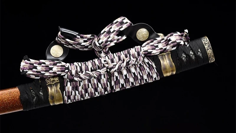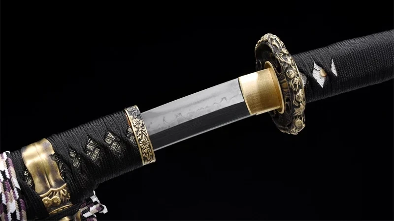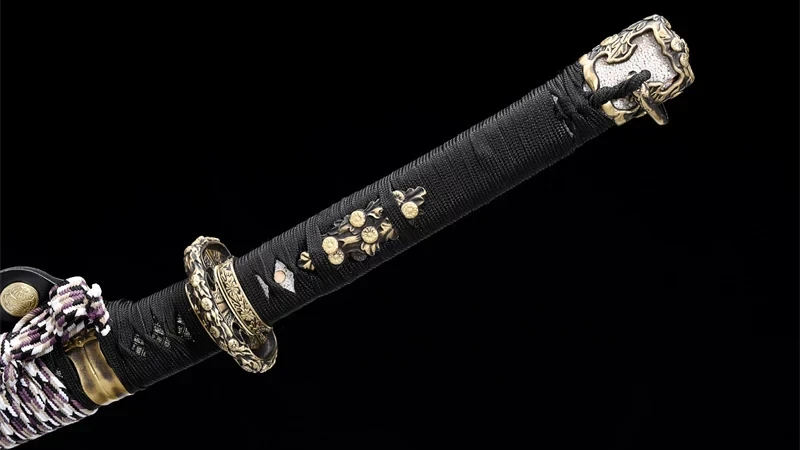 | Scabbard (Saya 鞘): | Grainy orange wood, half-covered by sageo, decorated with a gold ring featuring a flower. Gold-plated and engraved scabbard ends (Kojiri and Koiguchi) |