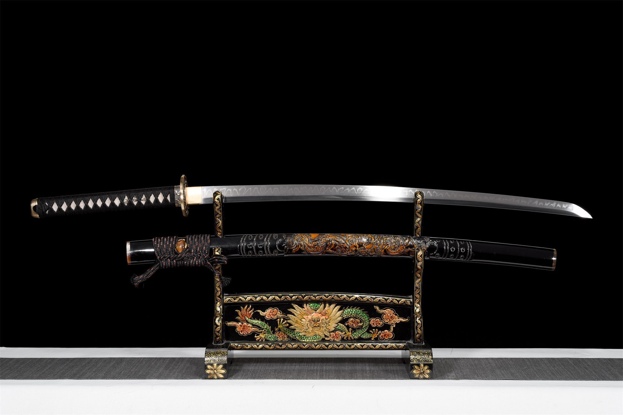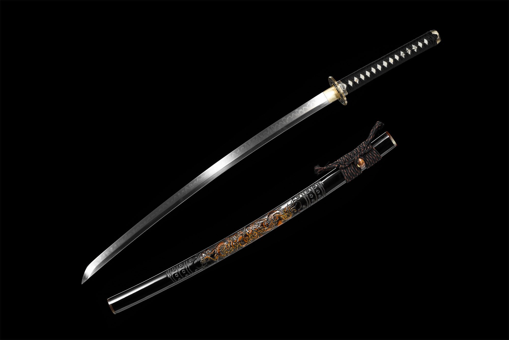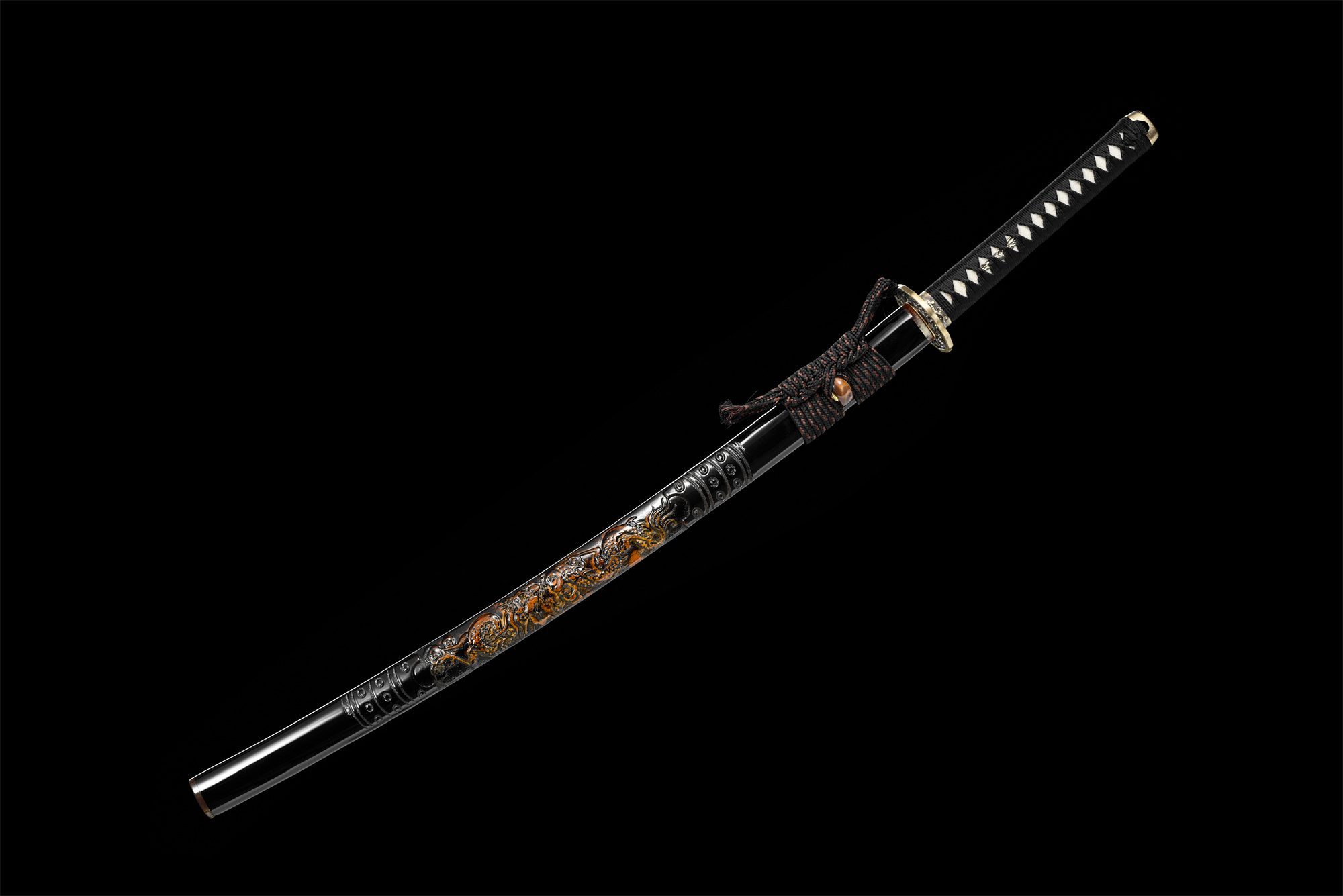 | Scabbard (Saya 鞘): | Lacquered hardwood saya, decorated with a carved dragon, |