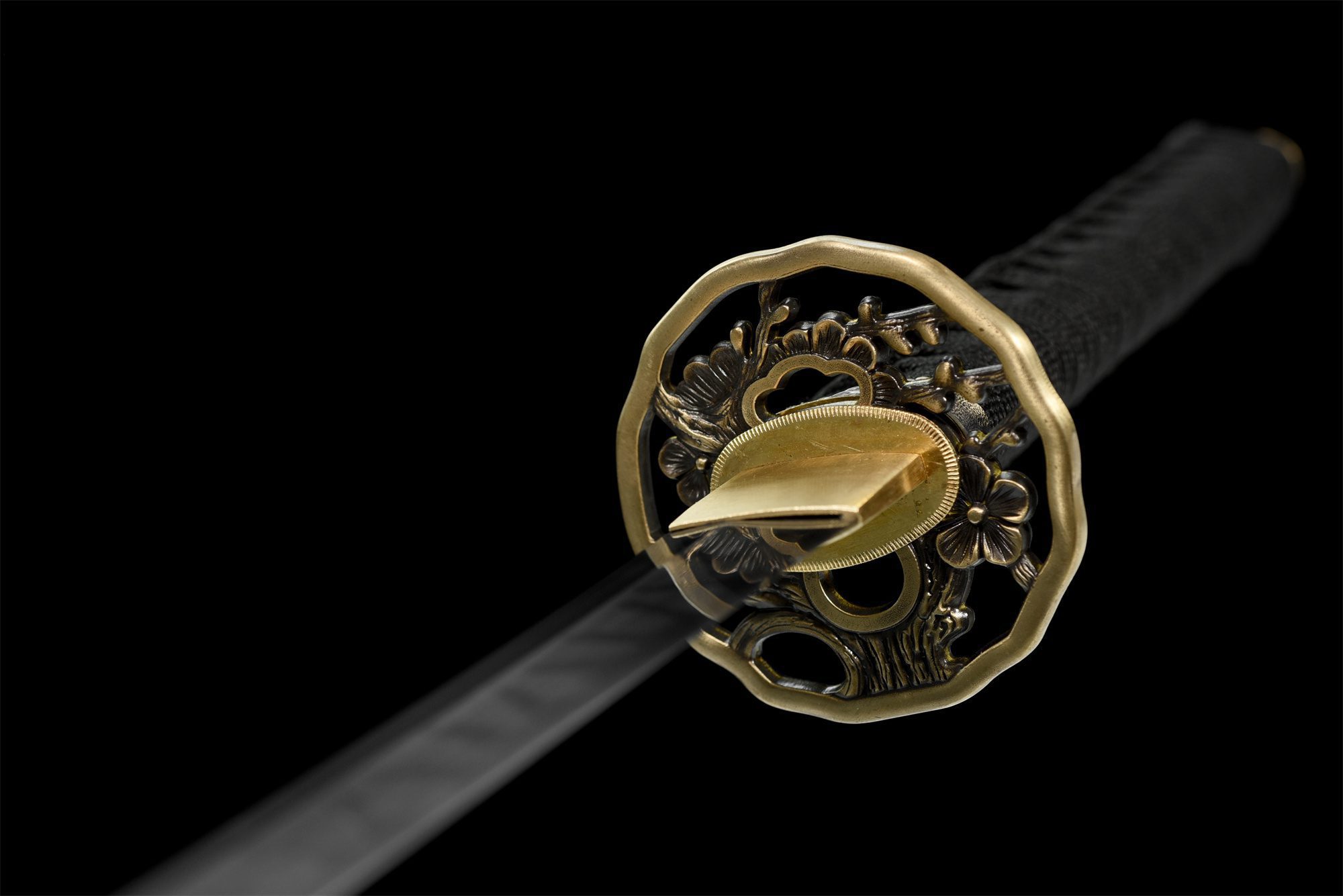 | Guard (Tsuba 鍔): No selection | Copper, rounded and gilded, carved and engraved with floral motifs, with Hitsu-ana for Kogatana and Kōgai |